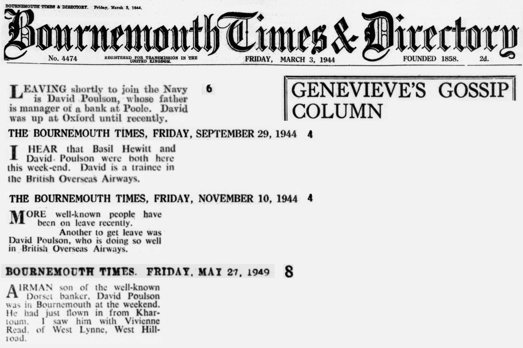 I’m not sure if there was any awkwardness about serving during World War II in a logistics role versus in the Royal Navy – the way the stories were told when I was young, I was left with the impression he was in the Navy during the war, but the memoir notes are unambiguous. And this photo is too – a very young David in his BOAC uniform. There’s also “Genevieve’s Gossip Column” in the Bournemouth Times with entries first saying in March 1944 that David was “…leaving shortly to join the Navy…” but by September that he was “…a trainee in the British Overseas Airways.”
